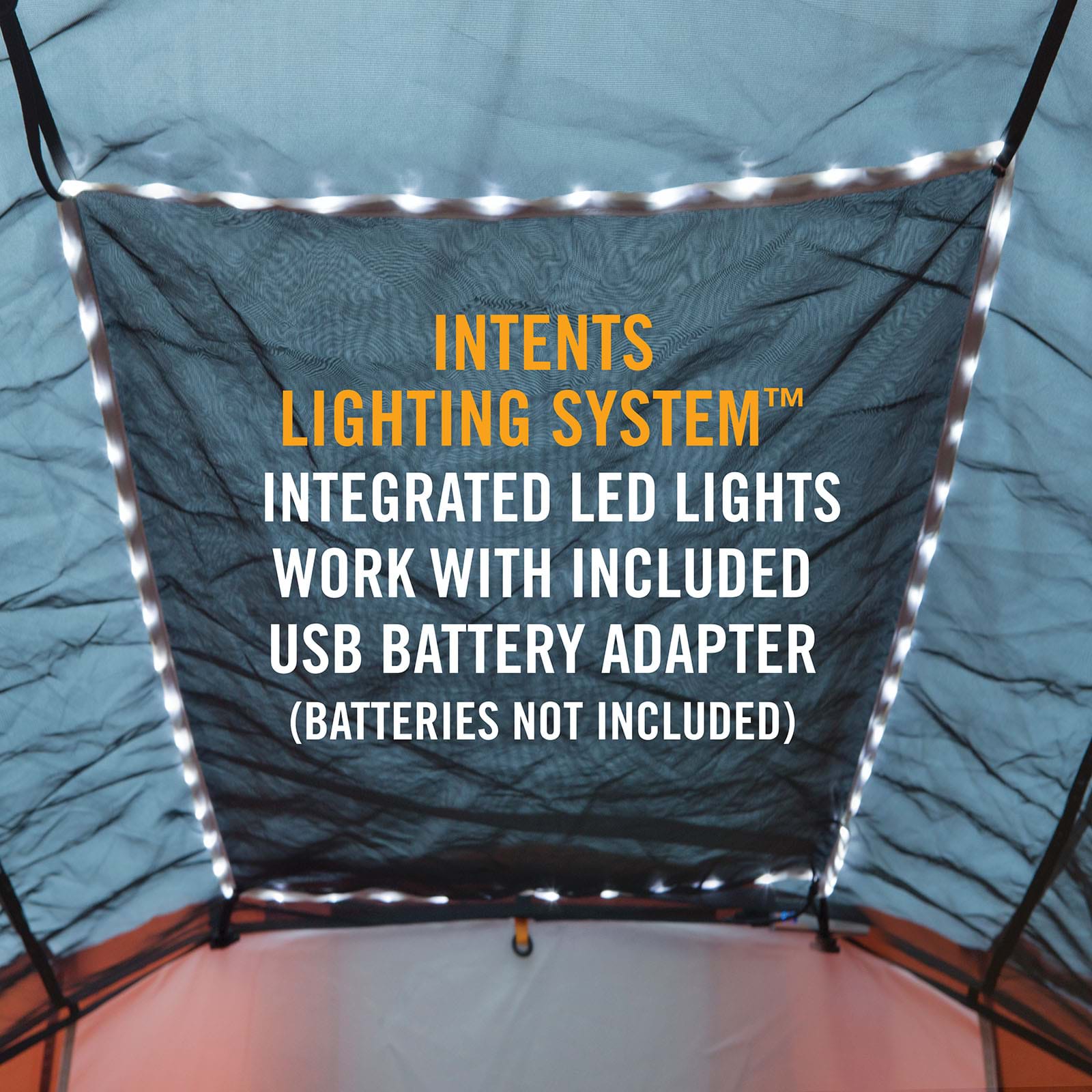 INTENTS LIGHTING SYSTEM™ with USB battery adapter (batteries not included) or use a standard power bank (not included)